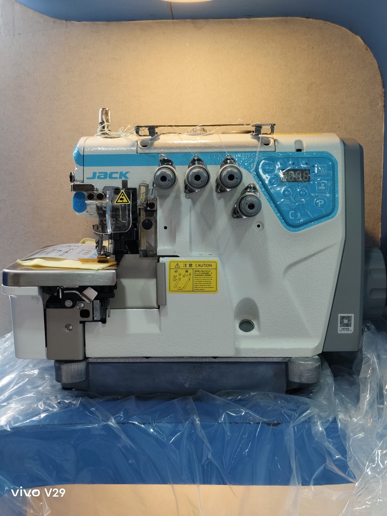 JACK BRAND INDUSTRIAL SEWING MACHINE C3-4 FOUR THREAD POWER SAVING OVERLOCK MACHINE WITH COMPLETE SET WITH AUTO ELETRICE THREAD TRIMMER