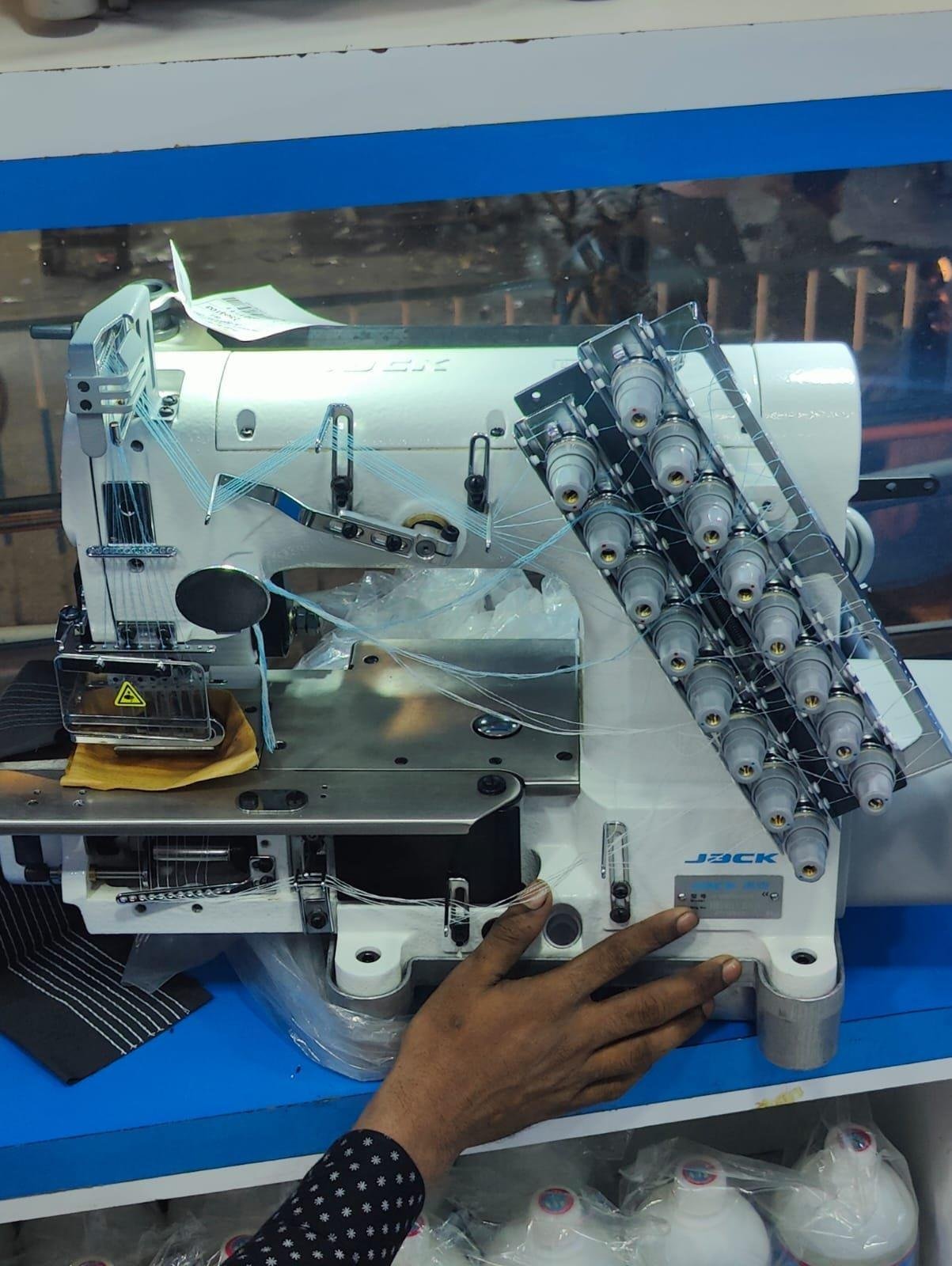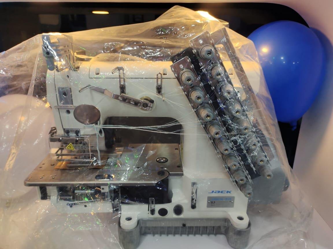 The Jack JK-8009 VCDI is a multi-needle chain stitch sewing machine, designed for parallel stitching at equal distances on various materials. It's used in production settings for applications like attaching elastic, ribbons, or on shirt fronts. The machine features an automatic thread trimmer and a pneumatic footlifter, along with a puller for uniform feeding.