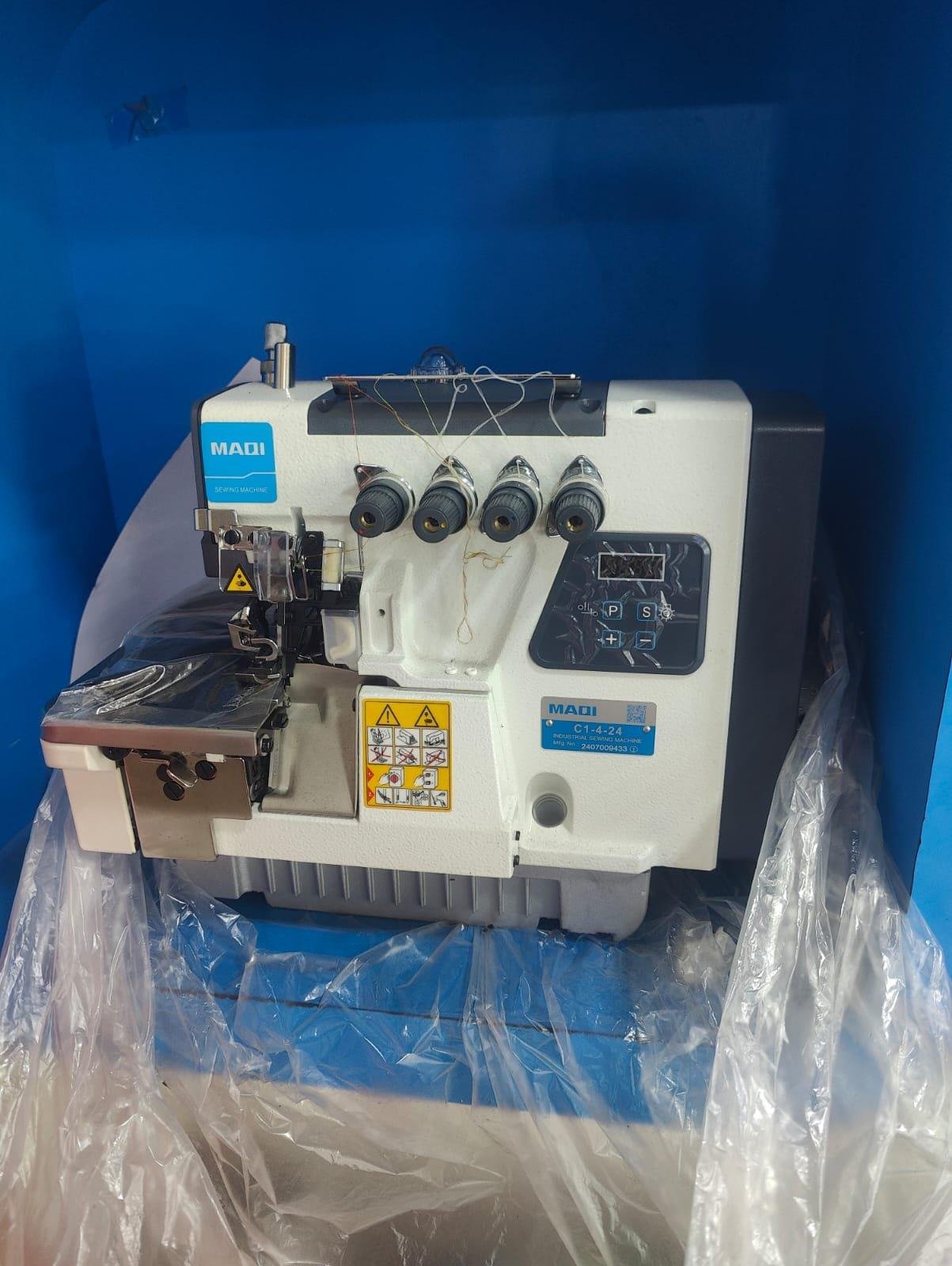 The Maqi C1-4-24 is a four-thread industrial overlock sewing machine with a mild steel body, designed for both light and thick fabrics like shirts, trousers, and knits. It features a motor-operated, semi-automatic design, a maximum sewing speed of over 5000 stitches per minute, and an integrated display. Key specifications include a 30.7mm needle bar stroke, a 2mm needle gauge, and a 3-year warranty on the motor and board.